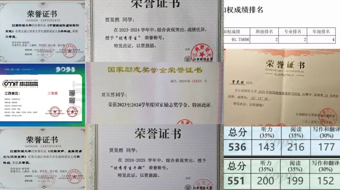 在学习上,他目标明确、勤奋刻苦,学业成绩位列专业第二,英语四级536分、六级551分,学习能力突出。他连续两年荣获国家励志奖学金,先后被评为优秀学生、优秀学生干部,并积极投身专业实践,参与工作室项目研发,斩获两项CCVR省级二等奖、一项数字媒体大赛省级三等奖,以扎实学识和过硬本领展现了VR学子的专业风采。