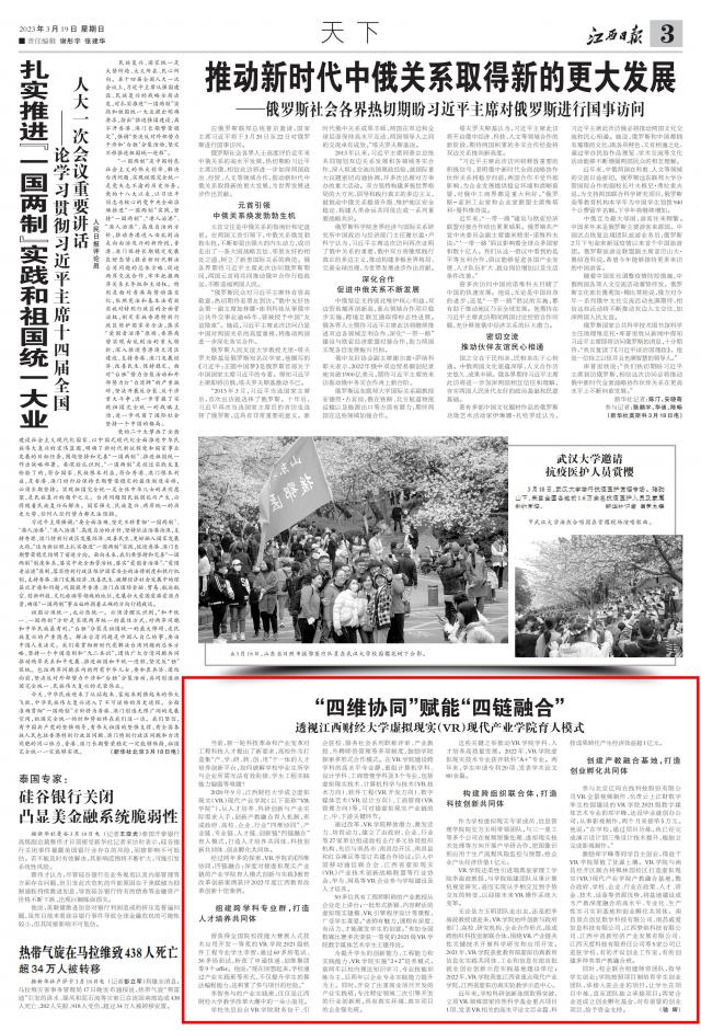 3月19日,江西日报03版发表《“四维协同”赋能“四链融合”》,文章详细报道了我校建设虚拟现实(VR)现代产业学院育人模式创新与实践。